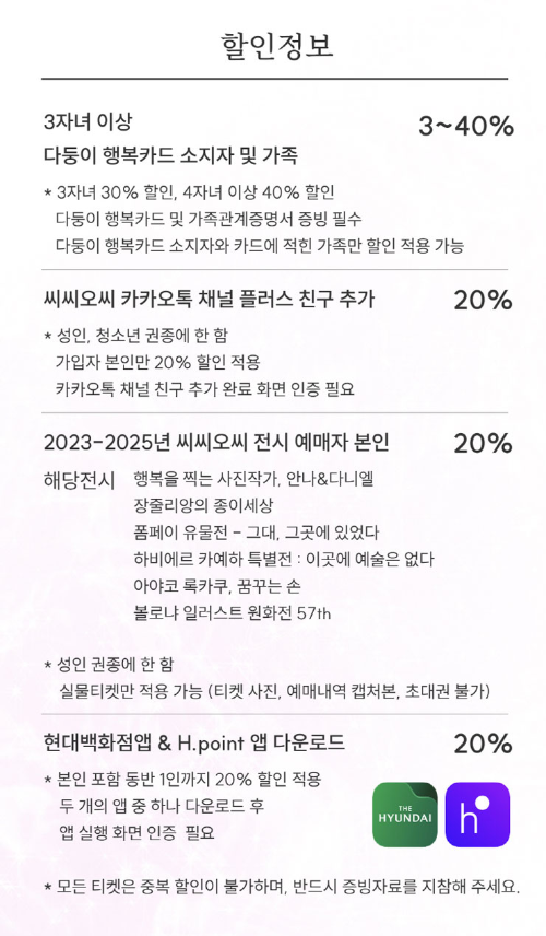 - 현대백화점앱 & H.point 앱 회원은 20% 할인 (성인권에 한함, 동반 1인까지)