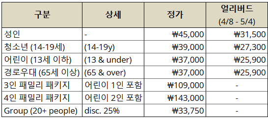 - 유아(36개월 미만): 무료 입장 (증빙서류 필요)